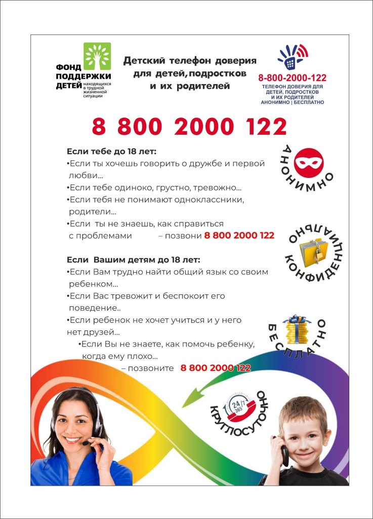 8 800 2000 122 или 124 — единый общероссийский номер детского телефона доверия — просто позвони в трудную минуту. Служба детского телефона доверия работает круглосуточно, анонимно и бесплатно, с домашнего и мобильного телефонов. Если линия занята, позвони в другое время. Будь настойчив в решении своих проблем